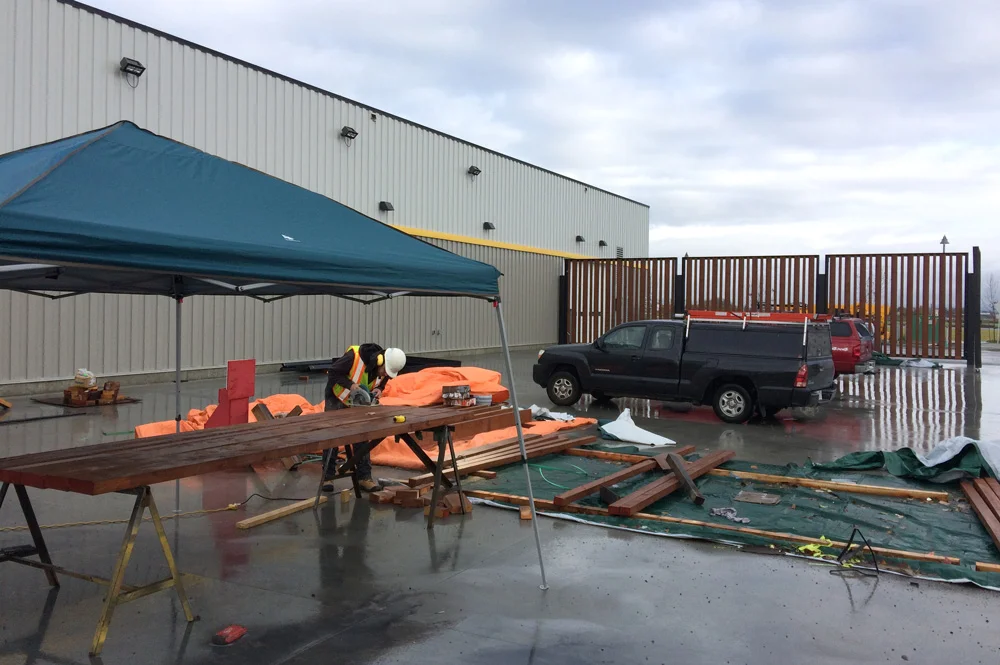 Installed decorative timbers at the entrance towers of the Tsawwassen Mills shopping centre. Also installed the timbers into the steel fence surrounding the Rona.