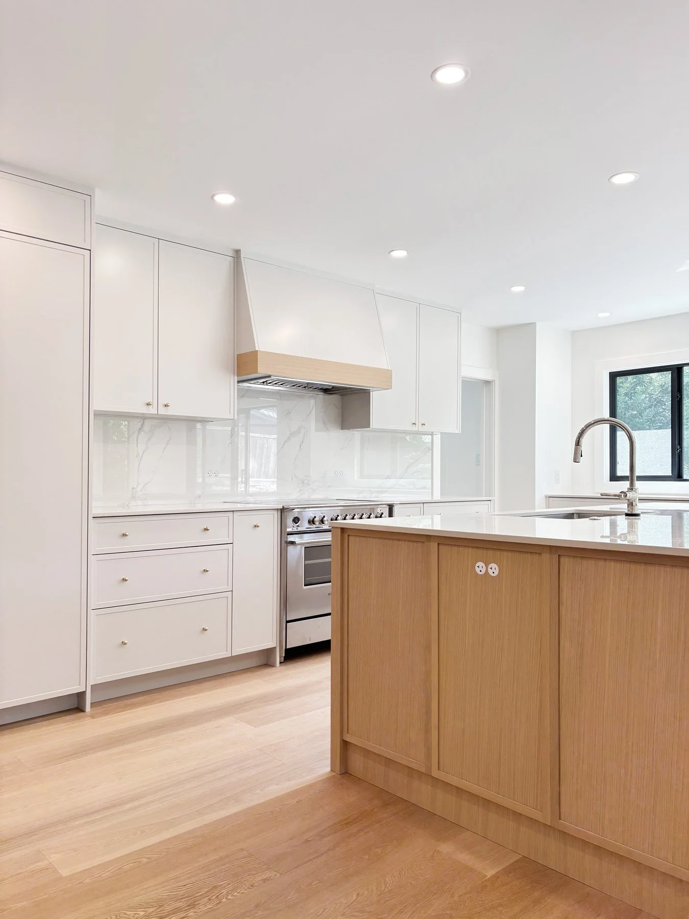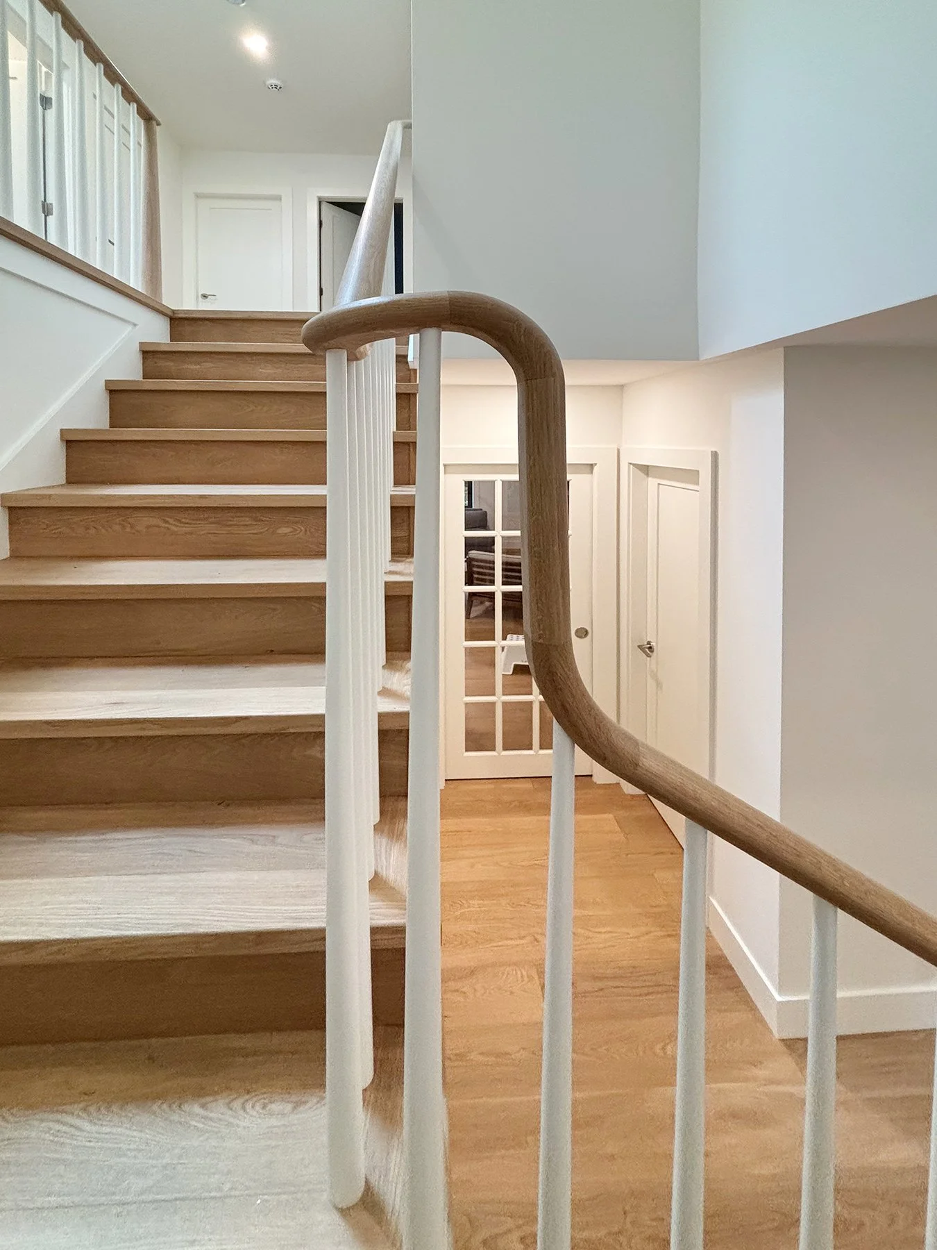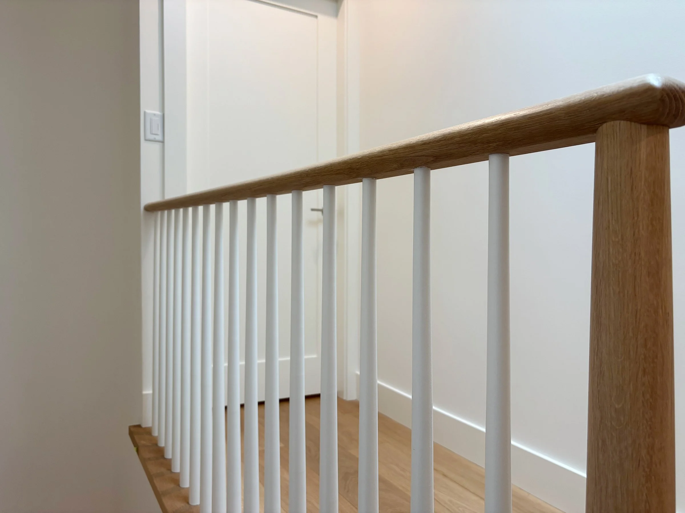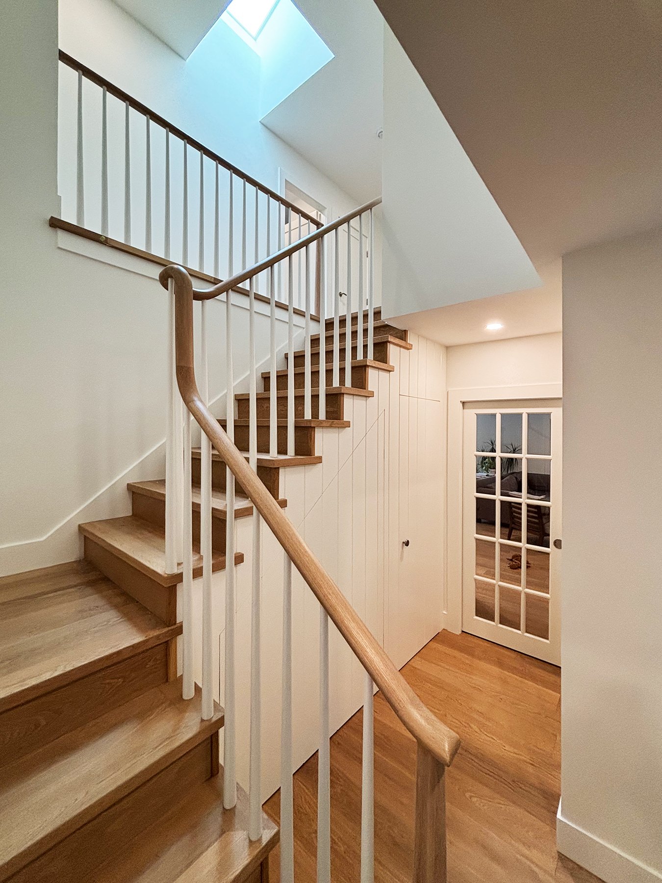This family home was built in the 1960’s and had undergone several “Frankenstein” renovations over the years, leading to mismatched finishes and awkward layouts. The HVAC system was inefficient, barely cooling or warming the home, and the air quality was quite poor. We collaborated with Christine Shandro Design to create a uniquely beautiful, comfortable, well-configured home tailored to homeowners’ lifestyle. The flowing oak handrail on the staircase, with hidden storage beneath the stairs is the feature piece when entering the home. The kitchen and bathrooms were all completely re-built for joy-of-use and timeless style. The homeowners now enjoy fresh air indoors, at just the right temperature, thanks to new high performance windows and a completely re-configured air duct system.